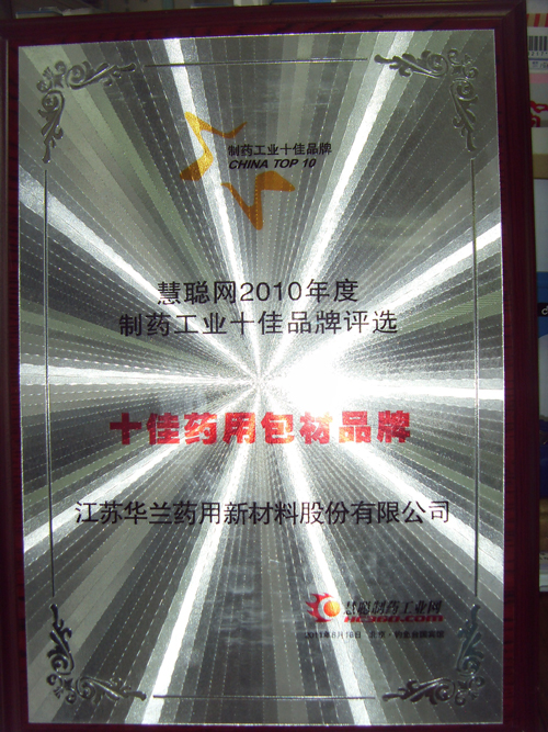 2011年8月18日,由慧聪制药工业网主办的“创新•责任•影响力——2010年度制药工业十佳品牌评选”颁奖盛典在北京钓鱼台国宾馆隆重举行。经过行业专家层层评审,慧聪揭晓了“十佳制药装备民族品牌”、“十佳制药装备创新品牌”、“十佳制药装备新锐品牌”、“十佳药用原辅料品牌”、“十佳药用包材品牌”、“十佳配套设备品牌”六大奖项。我公司“suncitygroup太阳集团”品牌在本次评选中荣获“十佳药用包材品牌”称号。